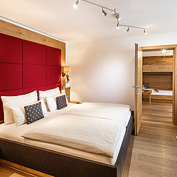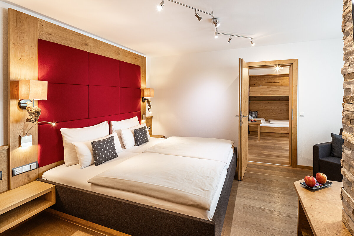 Die 49 m² große Familiensuite Gaisstein vereint alpinen Charme mit modernem Komfort und schafft durch Holz, Stein und Loden eine gemütliche Atmosphäre. Die Familiensuite besteht aus zwei getrennten Zimmern, die sowohl über eine Verbindungstür als auch über separate Eingänge erreichbar sind – so genießen Sie maximale Flexibilität und Privatsphäre.