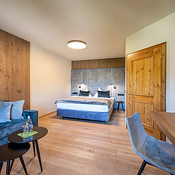 The 44 m² Mountain Family Plus Suite offers plenty of space and privacy for the whole family. The bedroom is equipped with a comfortable box-spring bed (180 cm x 210 cm), and the separate children's room with bunk beds and TV provides space for the little ones. A pull-out double sofa in the master bedroom offers additional flexibility. The entrance hall is particularly practical, giving you access to the bathroom with walk-in shower and separate toilet without having to go through the bedroom. The balcony completes the suite and invites you to relax.